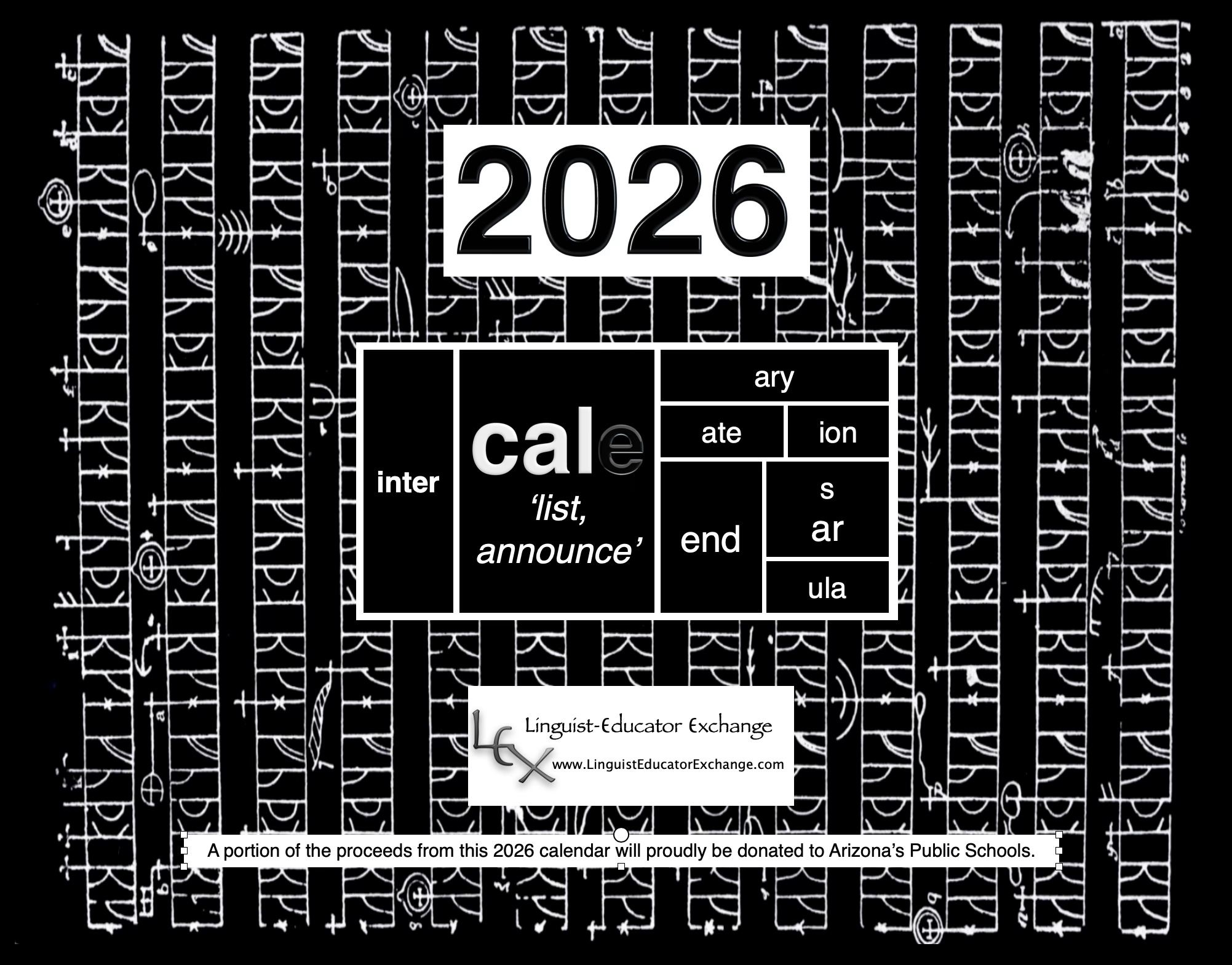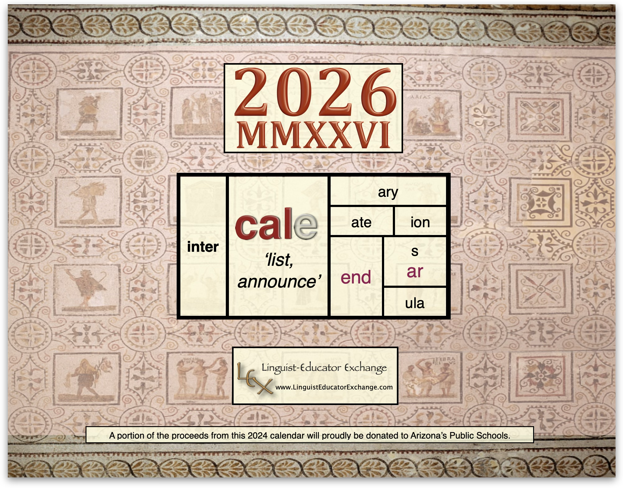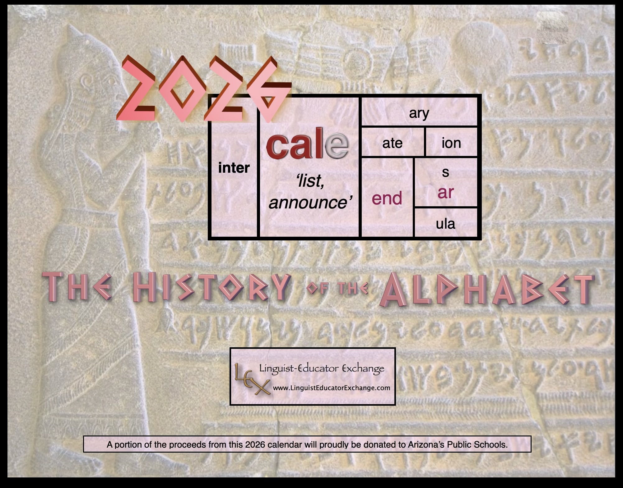 6. The History of the Alphabet LEX Calendar. Each month features a study of two or three alphabetic letters, their history, and their relatives.